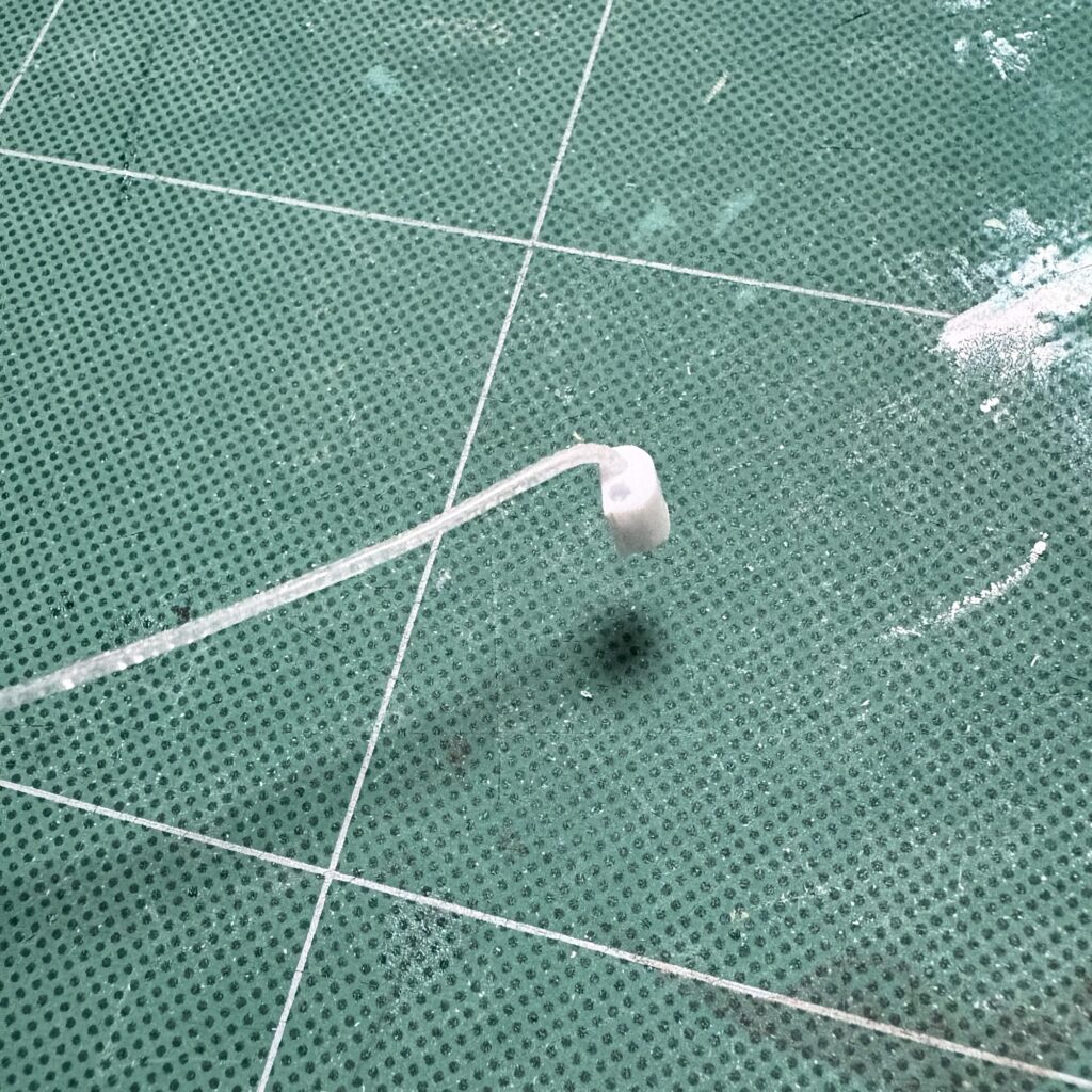 何に使ったか覚えていないが、プラバンを積層した棒状のものがあったのでかまぼこ状に削り、ピンバイスで1.2Φの穴をあけオイルキャッチタンクを試作