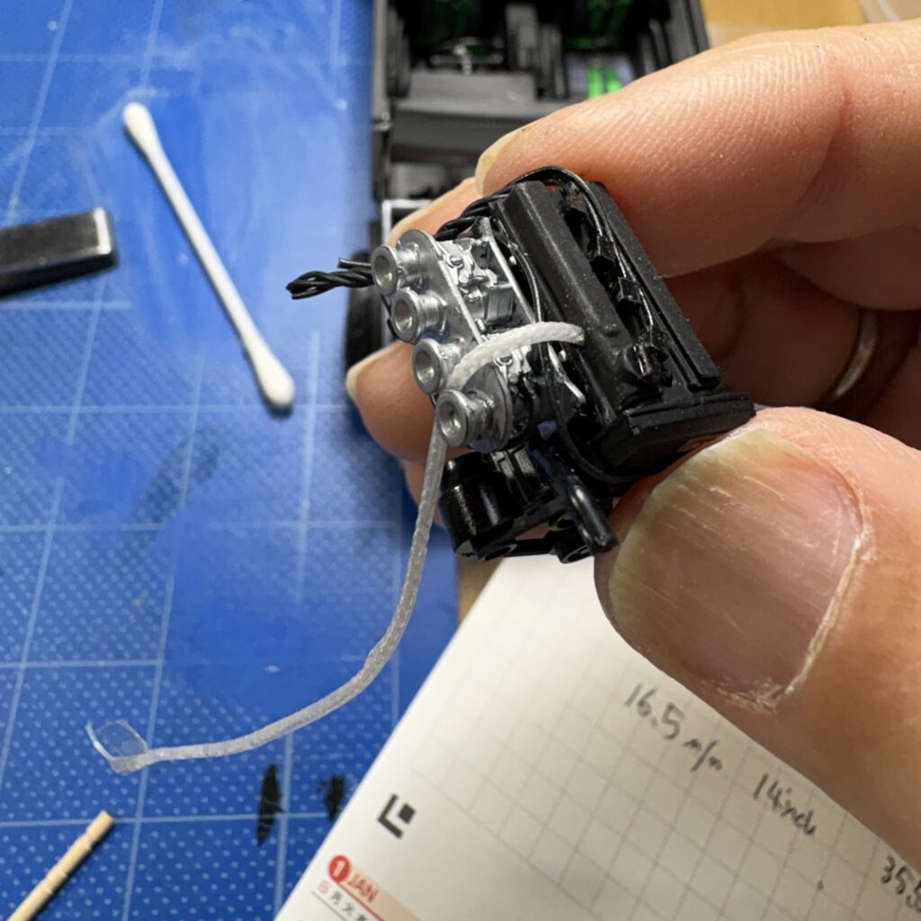 ディストリビューターのキャップがランナーについている間に一カ所の凸をニッパーで切り取り0.55Φの穴をあけ、0.5のパイピングケーブルを差し込み接着。ダイレクトイグニッションなのでケーブルはインテークマニホールド側からエンジン後ろに引き込む。