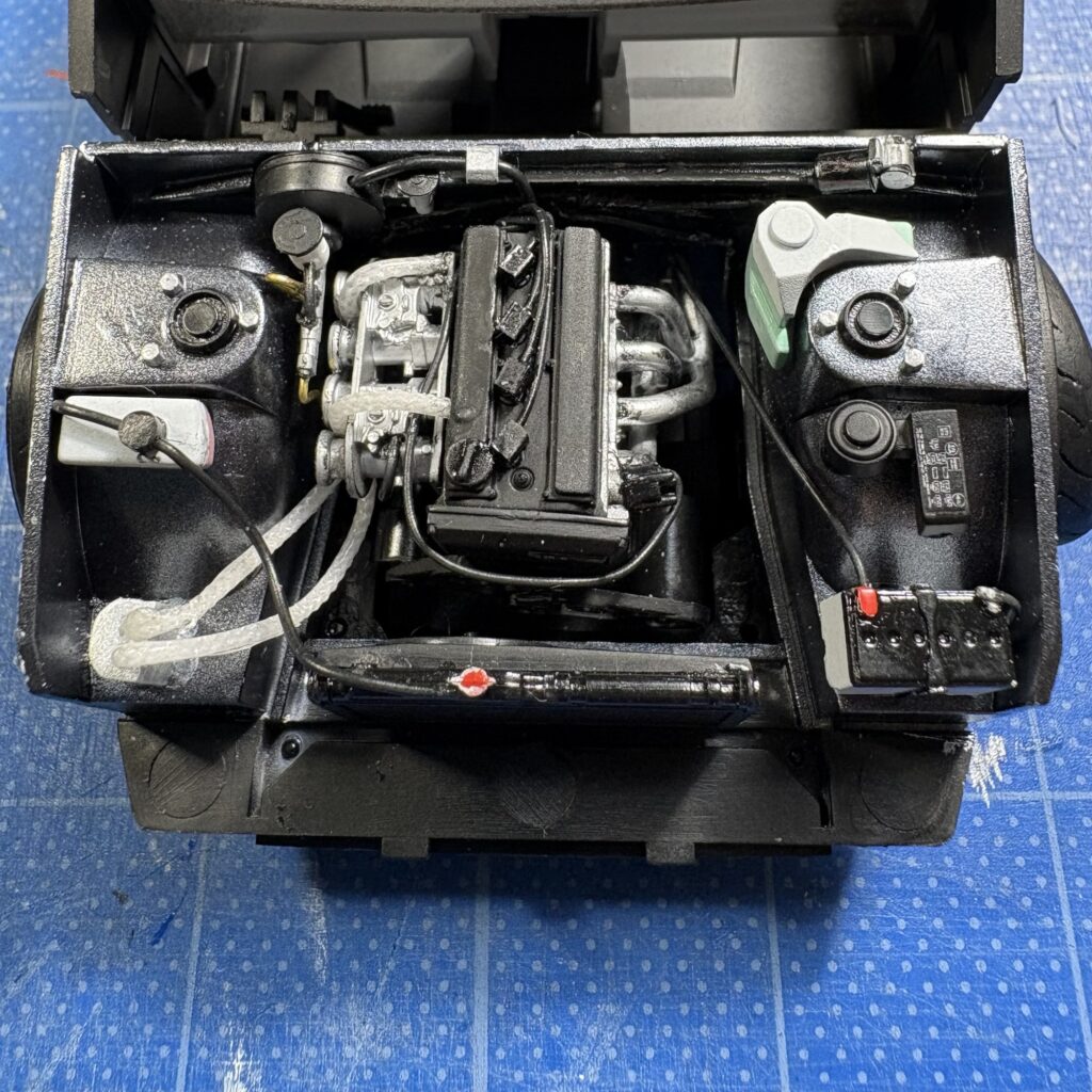 購入したデカールにヒューズボックスの蓋の印字があったので貼っておいた。その他コーションプレートのデカールもあるが、バルクヘッドが車体側とシャーシ側に分かれているのでシャーシをボディに組付けた後の最終の仕上げ工程となる。