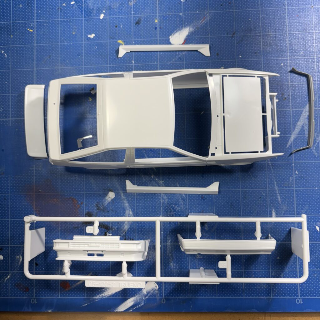 外観的にはキット添付のサイドステップが使用でき、アオシマTRD N2用のばら売りランナーからリヤスポイラーとジャンクパーツからフジミのトレノ用リップを調達。