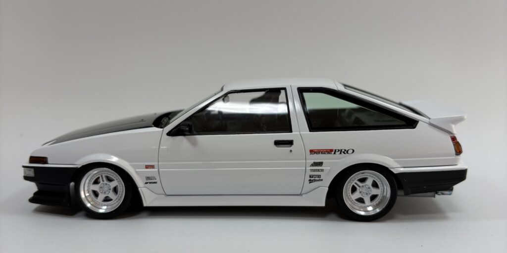 フジミのキットをベースにキャロットトレノ、同、キットのアドバンカローラを作った、となれば「ドリキン土屋」ファン、AE86ファンとしては、現役のストリート号(マメ号)は外せない。3台並べてこそ価値があると思う。(勝手に思っている)香港のZoomOnという会社がアオシマのトレノ後期をベースにしたトランスキットをリリースしているが、2025年末現在HKD488.00 (現地価格換算約¥9,800)、日本で輸入販売されているものが¥15,000くらいの値が付いている。ボンビーサラリーマンの小遣いではこのトランスキットを買えないので、入手したデカールと奮発した別売ホイールを使って再現する。