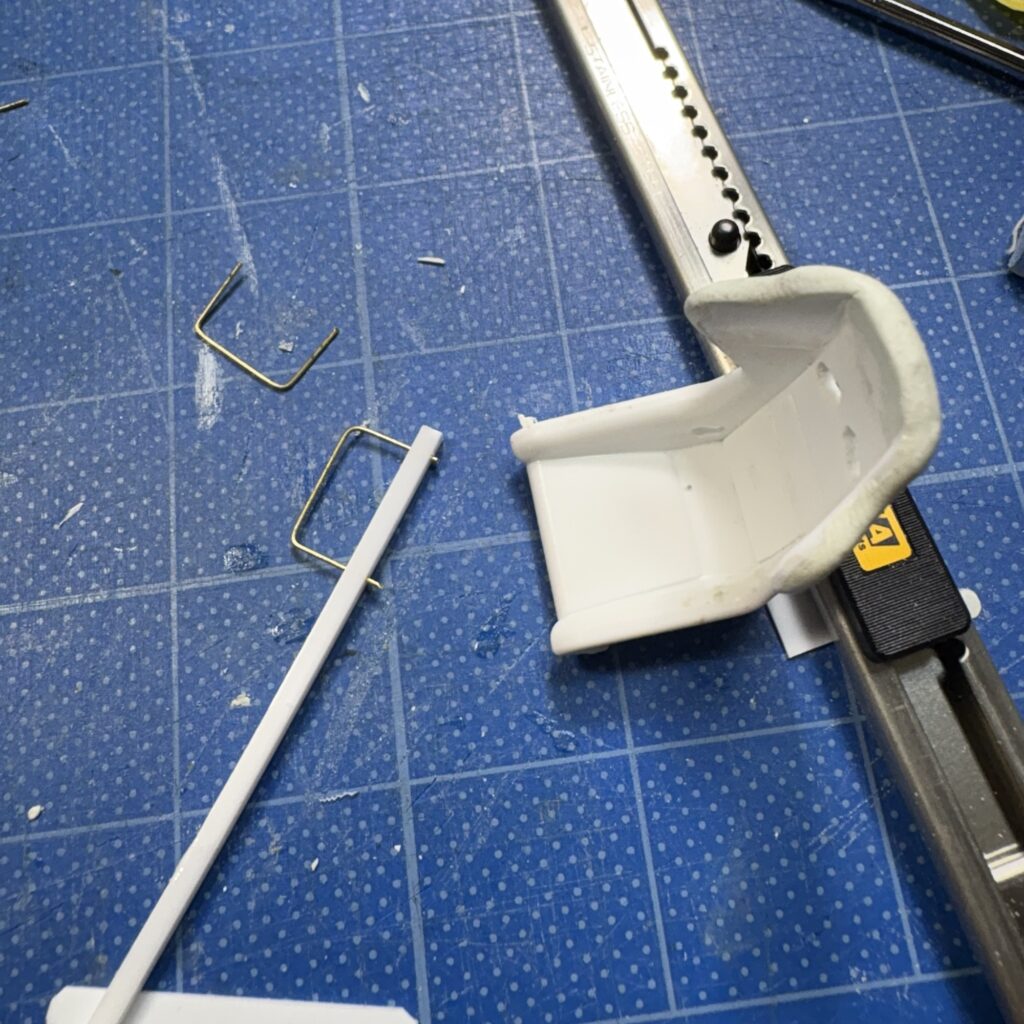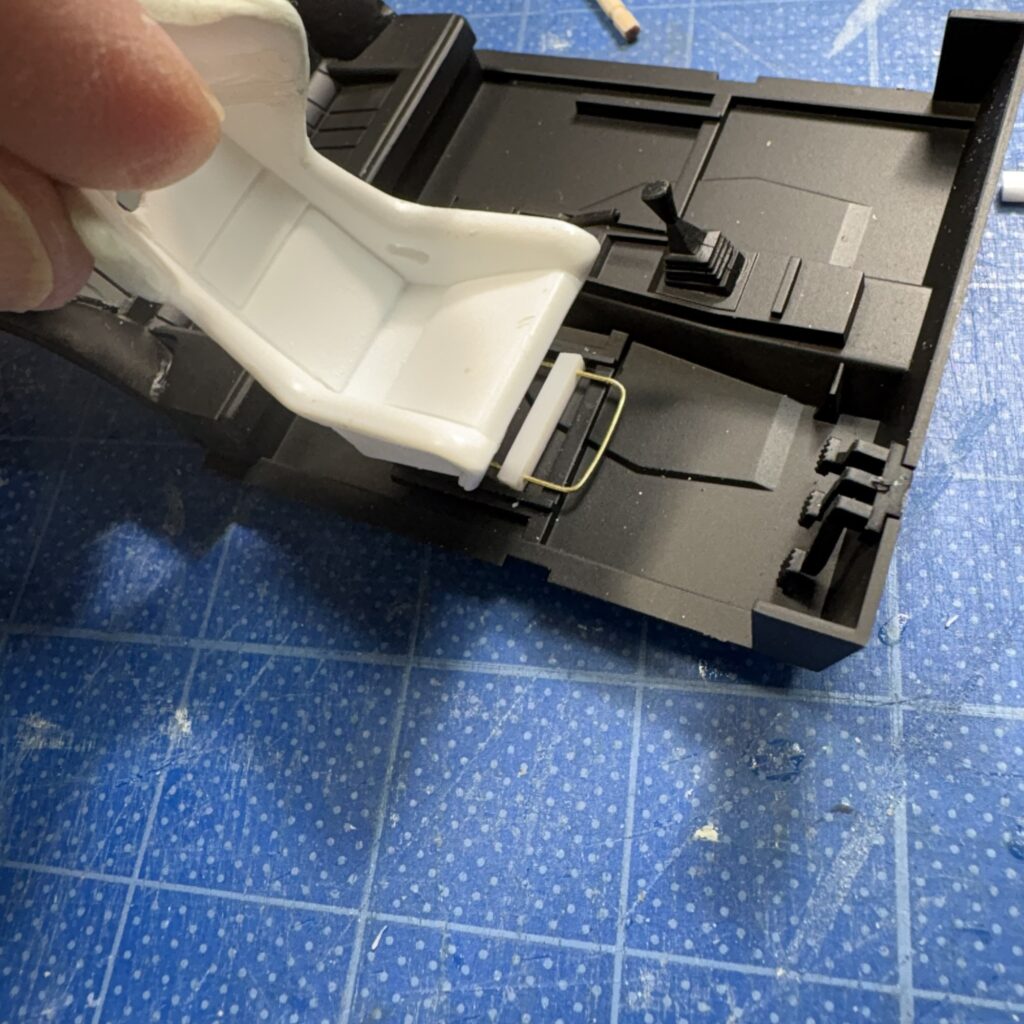 どこかで見かけたのでまねしてタミヤの1mm角棒と0.5Φの真鍮線でシートスライドレバーを作ってみた。