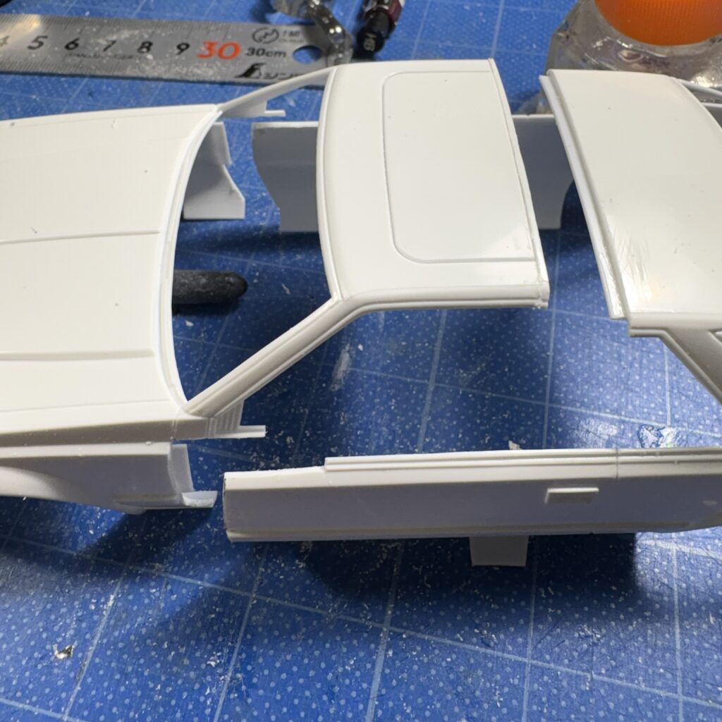 車体はできるだけ継ぎ目が目立ちにくい天井部のサンルーフ部とドアの前端を切断、シャーシはフロントシート付近で強度を考えV字にカットして詰めることにする。