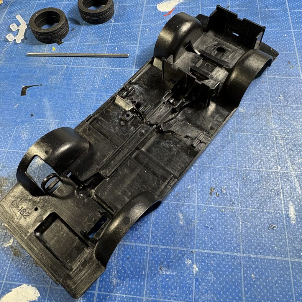 モーターライズの名残で歯車分の幅が広い左側のホイールハウスの部分をプラバンで継ぎ足し、ホイールハウスの前部分を切り離し、幅を詰めて再利用、接着した。