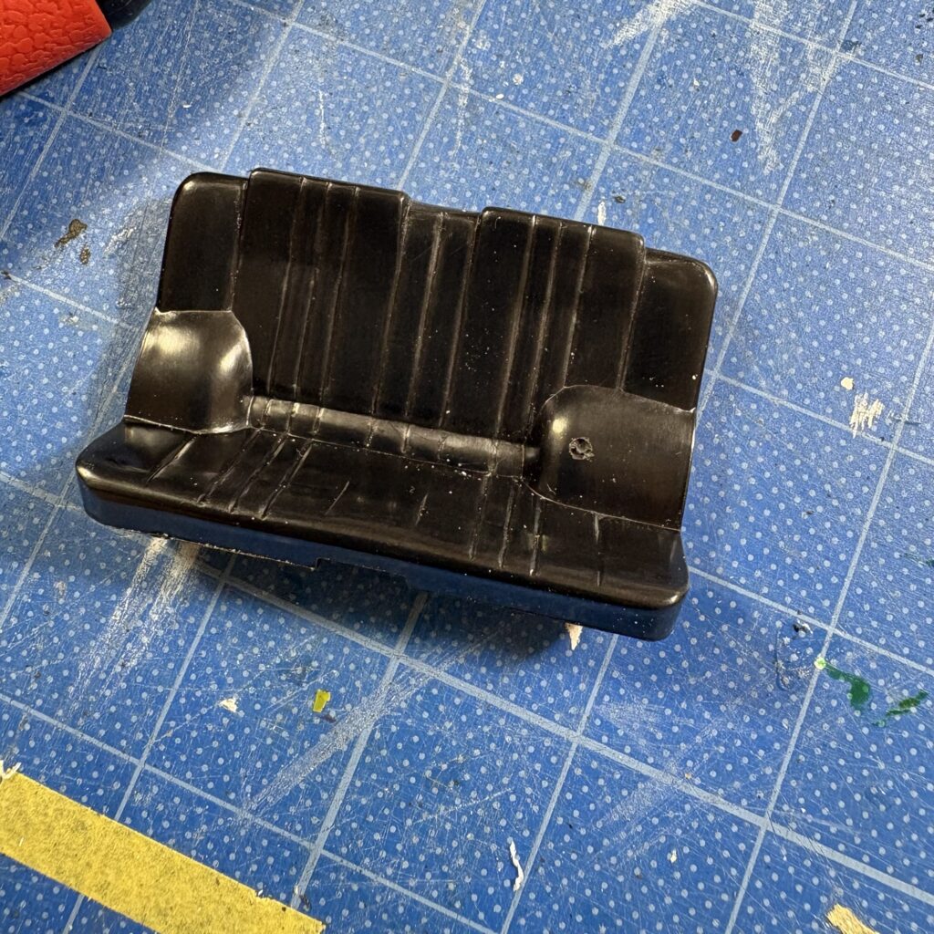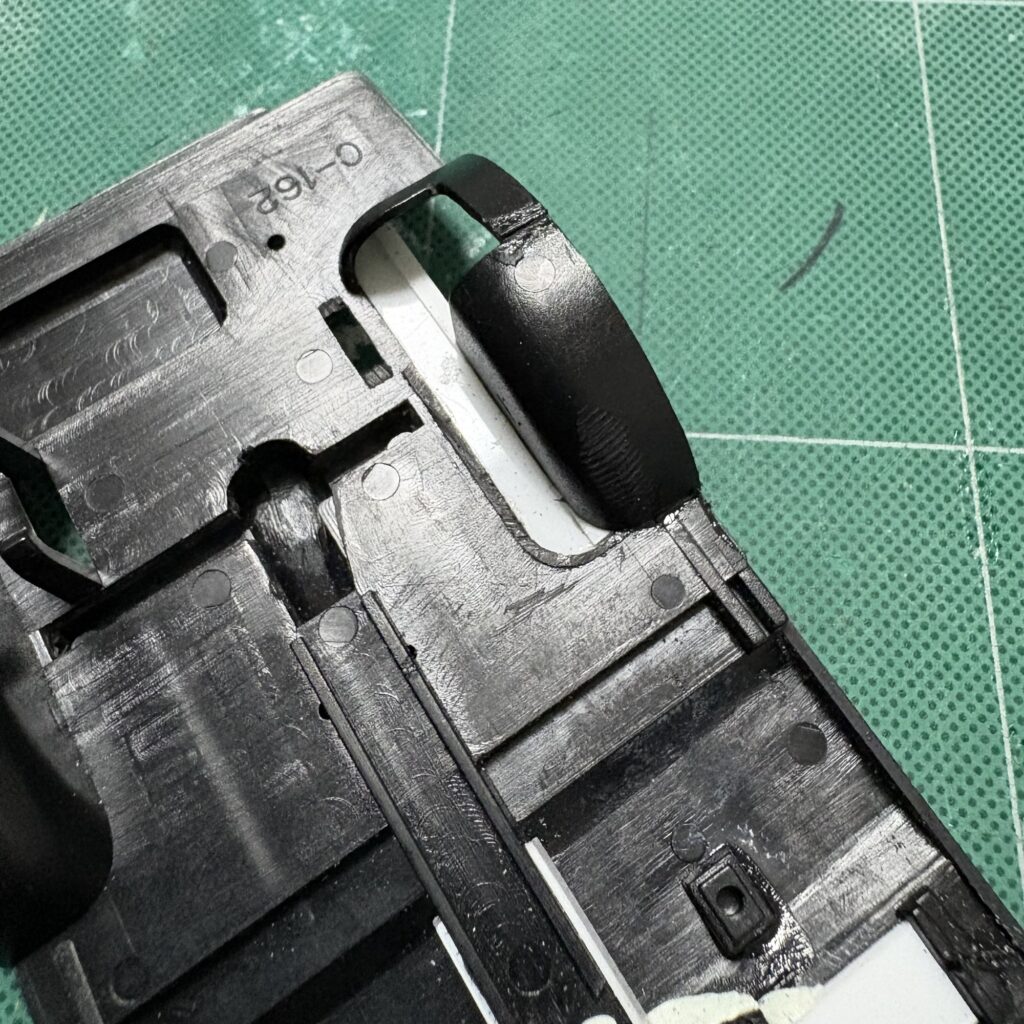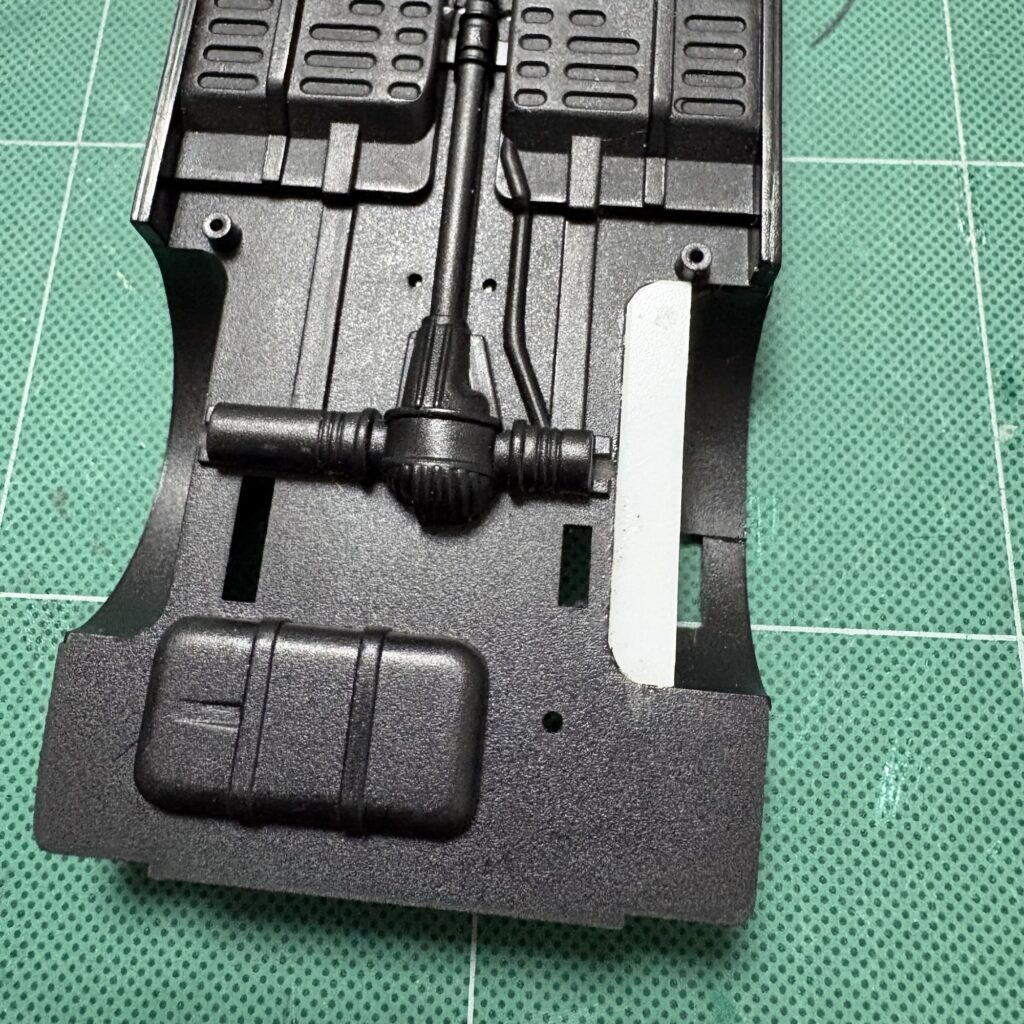 モーターライズの名残でホイールハウス(特に左側)がリアシートに影響している。見えにくいしそのまま作ればいいじゃん?と言われそうだが、部品点数の少ないキットだけにせっかくなのでちょっと手を入れてみる。