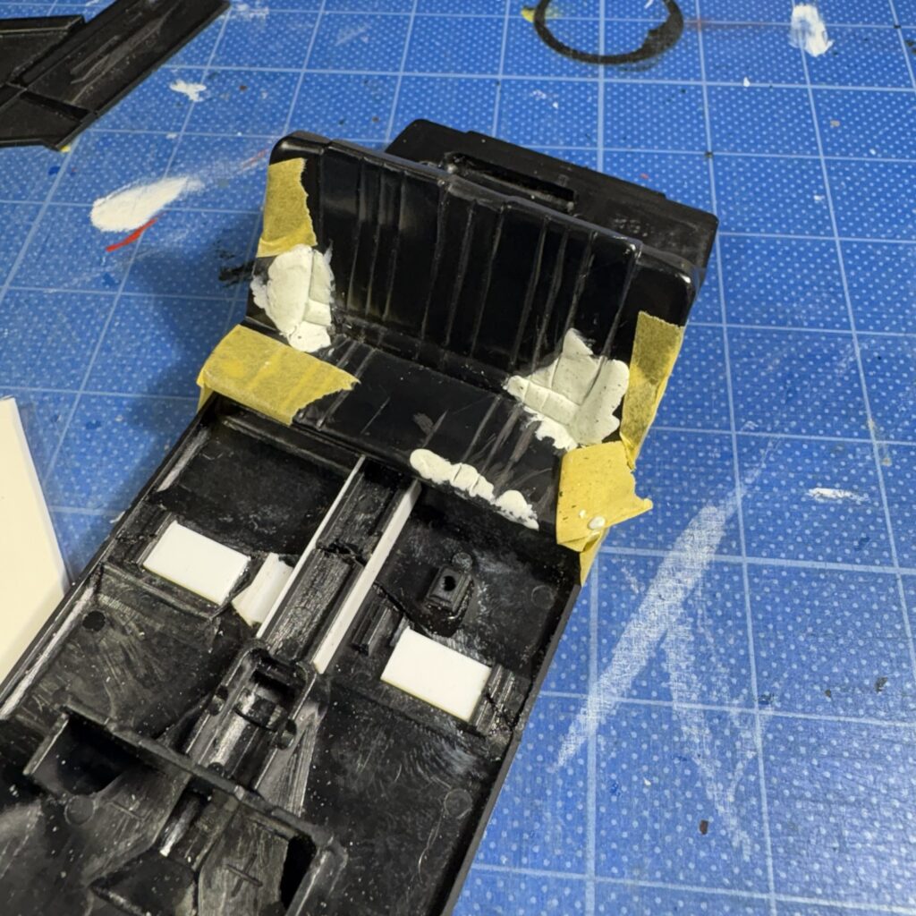 リヤシート、左右のホイールハウス部を切り取りプラバンの破片で裏打ち、接するシャーシのホイールハウスと仮合わせしてエポキシパテで造形しなおした。