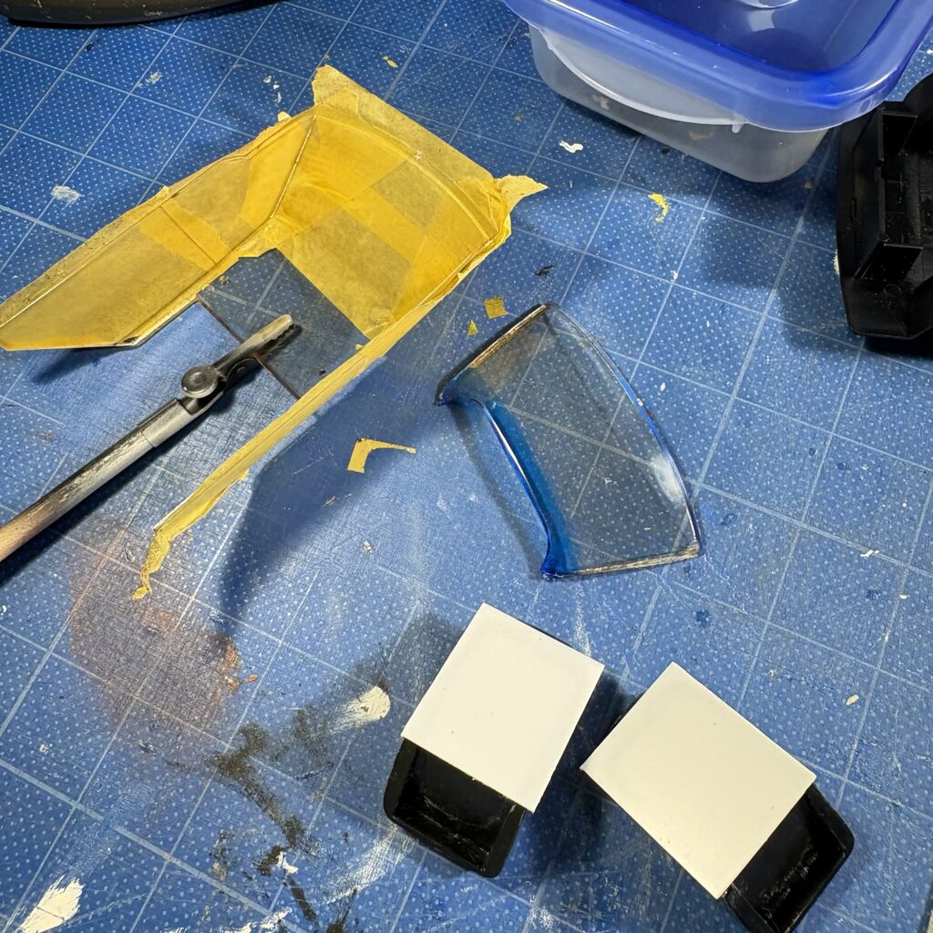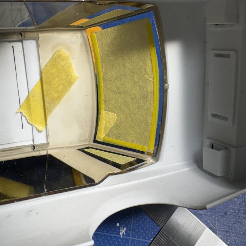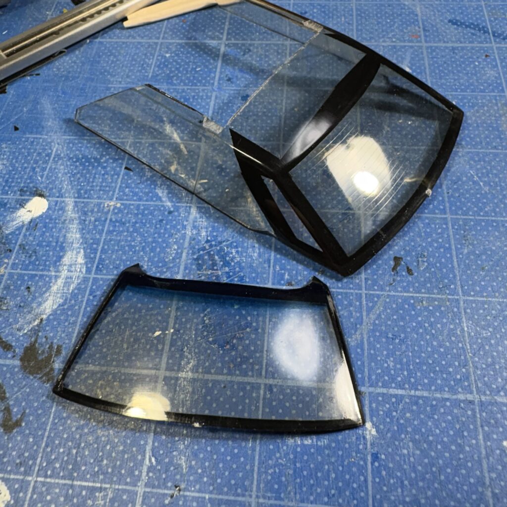 リヤとフロントは外からマスキングテープを貼ってマジックで窓枠に沿わせながら型取り、裏から貼りなおして曲線対応のニチバンのクリアラインテープで微調整。