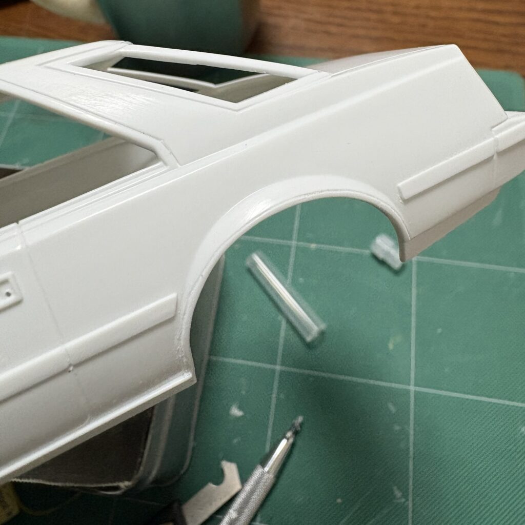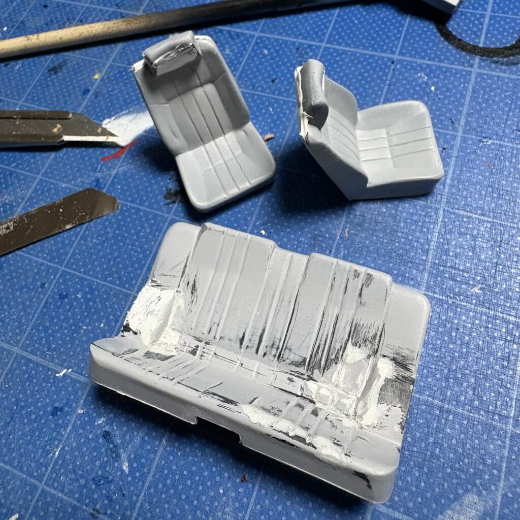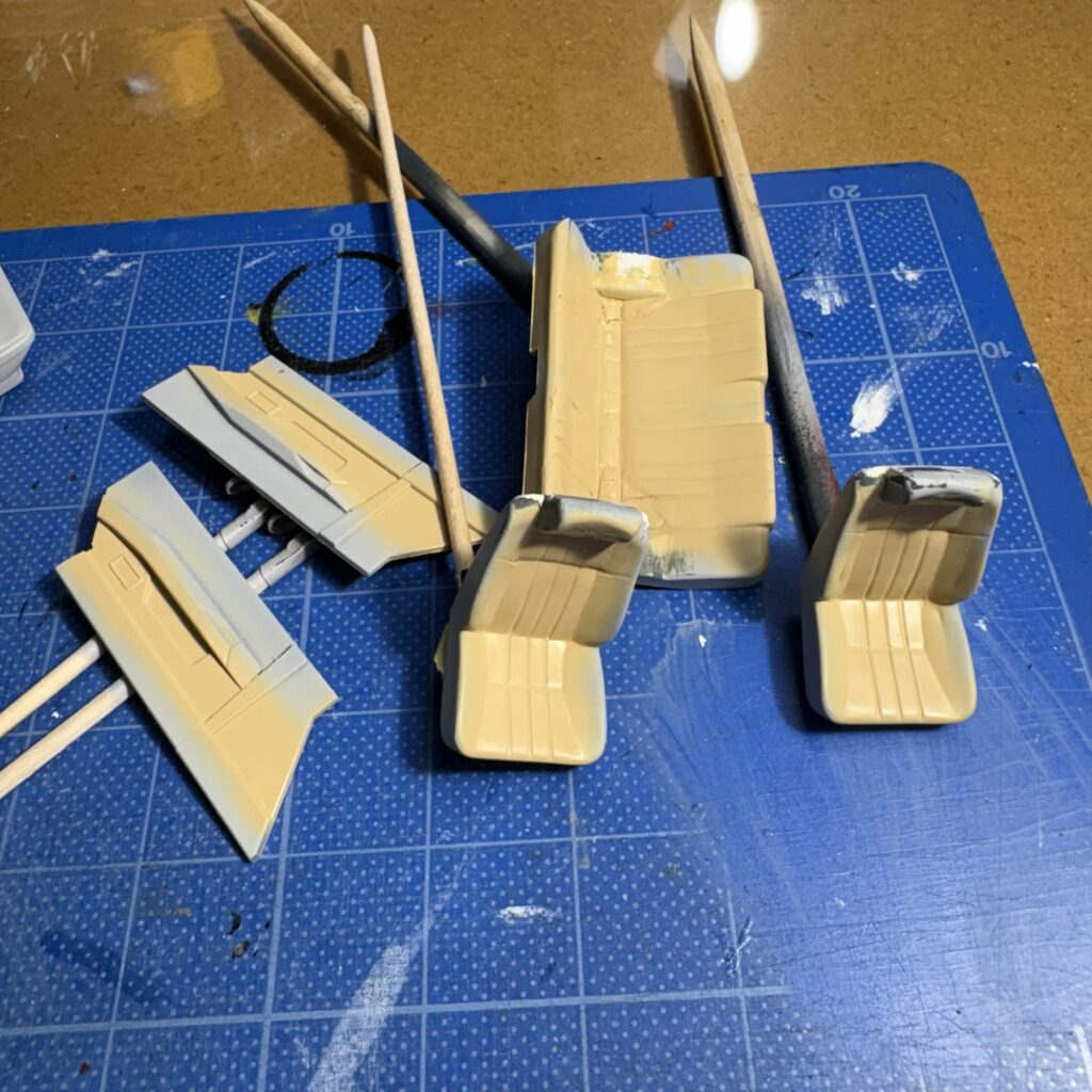 ボディと一緒にグレーのサフェーサーを軽く吹き、タイヤハウス部を調整したリヤシートと一緒にモールドのヒケやプラシートとの境目などをタミヤパテ(白)で調整。