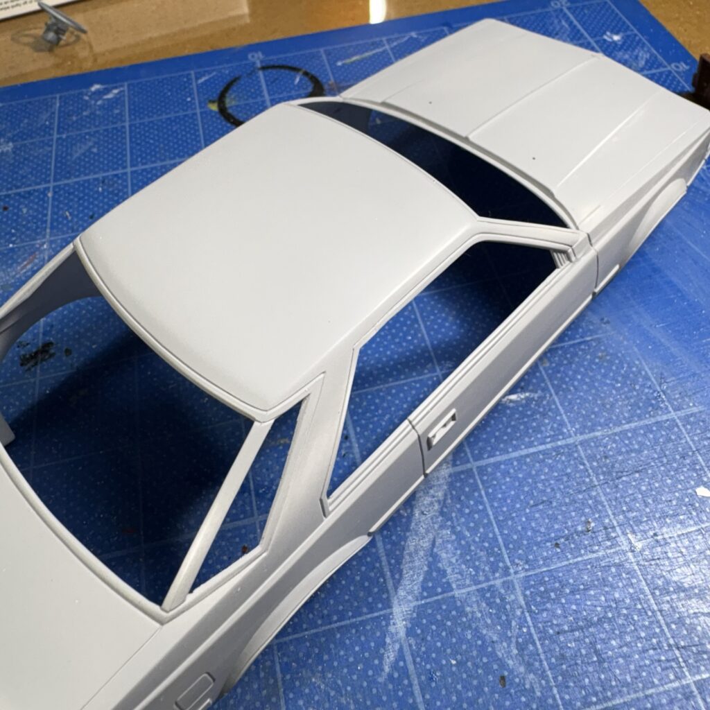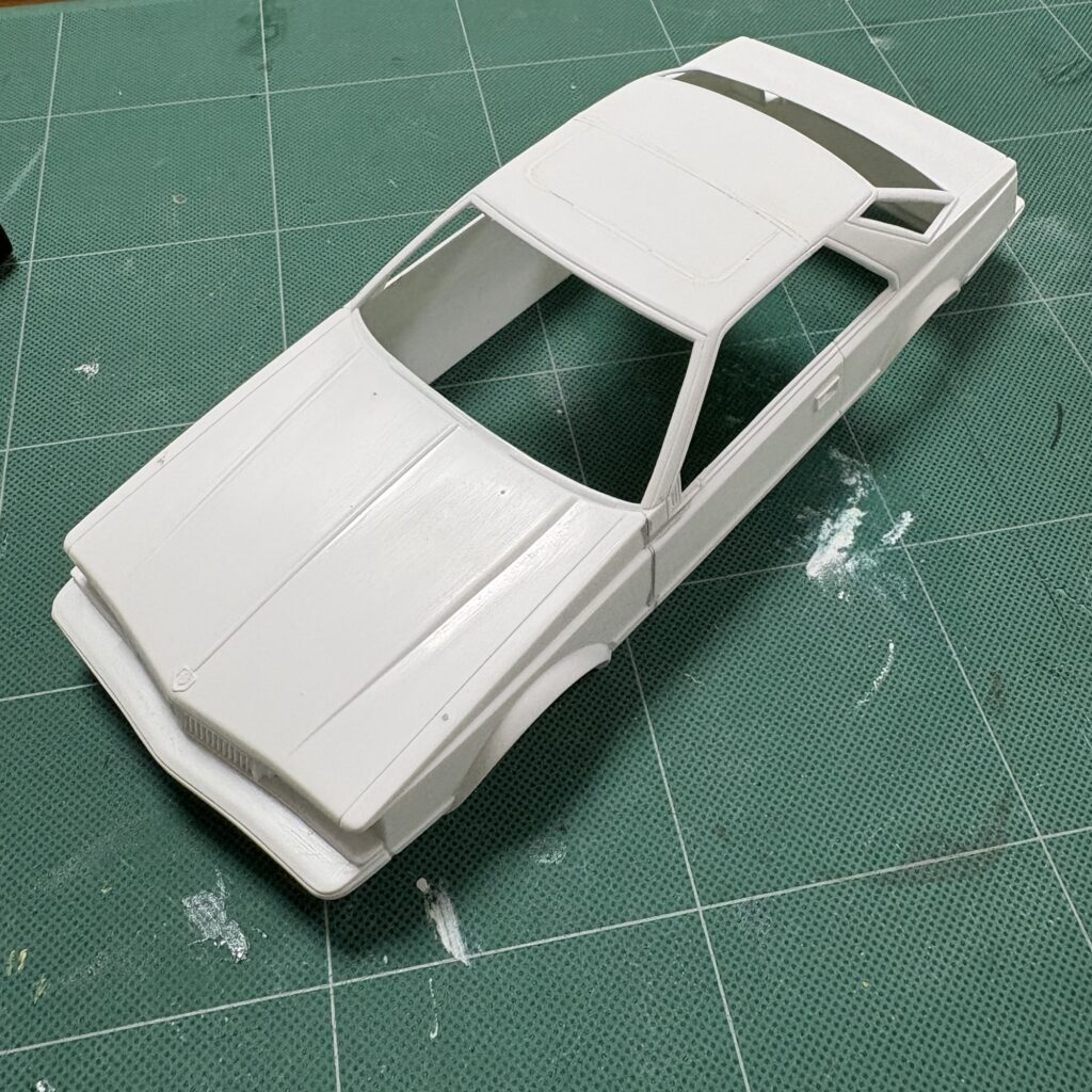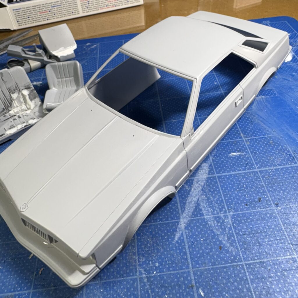 ボディと一緒にグレーのサフェーサーを軽く吹き、タイヤハウス部を調整したリヤシートと一緒にモールドのヒケやプラシートとの境目などをタミヤパテ(白)で調整。