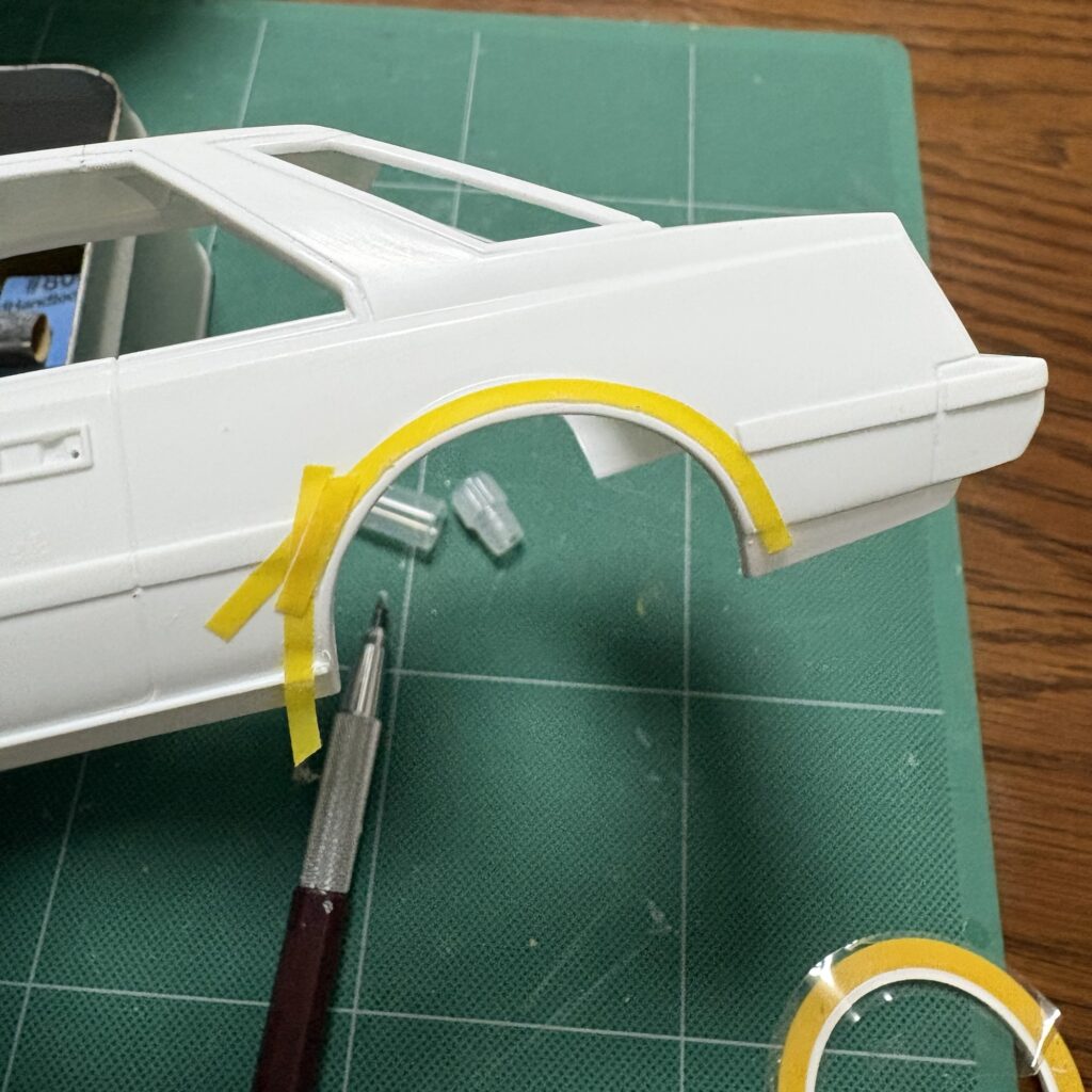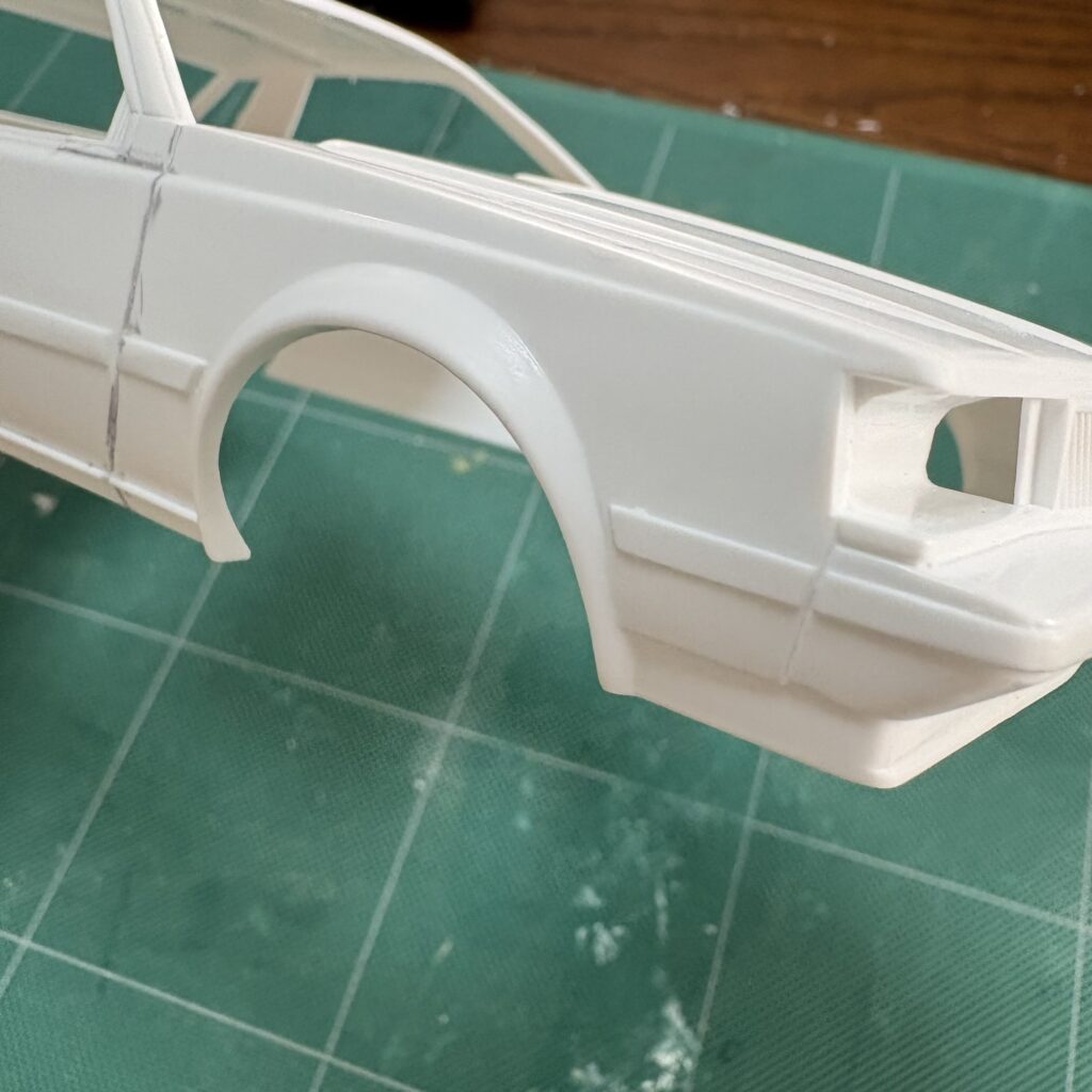 本来はEX SALOON、GXといったラグジュアリー系のグレードに装備されていたメッキのフェンダーアーチモール、キットのフェンダーの張り出しが実車より大きいように思い、ディーラーオプションの体でマスキングしてスジボリしてみる。細切りのミラーフィニッシュか塗装にするかは未定