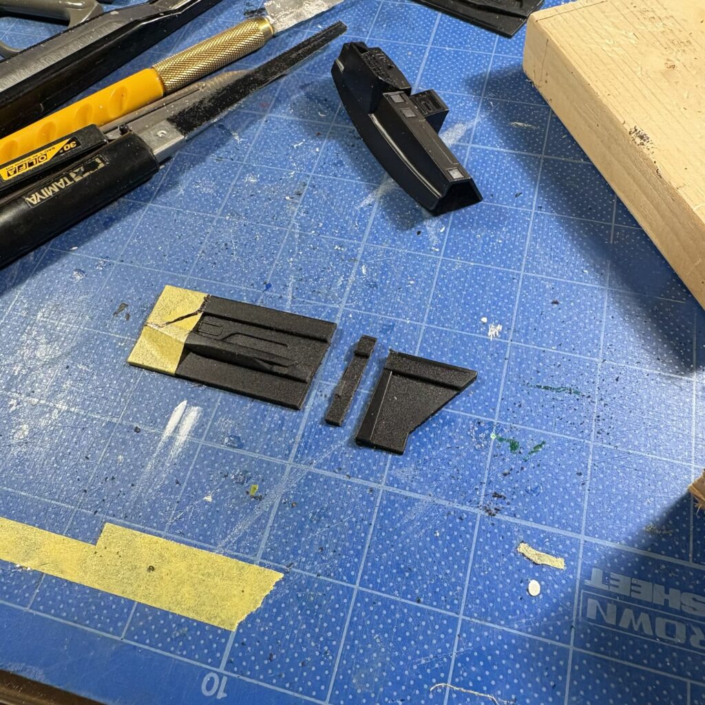 フロントシートの肉抜きされた部分に0.5tのプラシートを貼り、削り出す