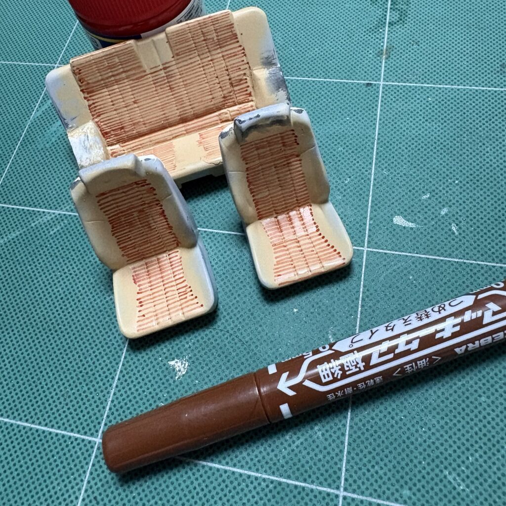 キットは座面と背面の生地の切り替え部に、黒内装用のデカールが付属しているが、茶系の内装にするので茶色の油性ペンで線を引いてみた。