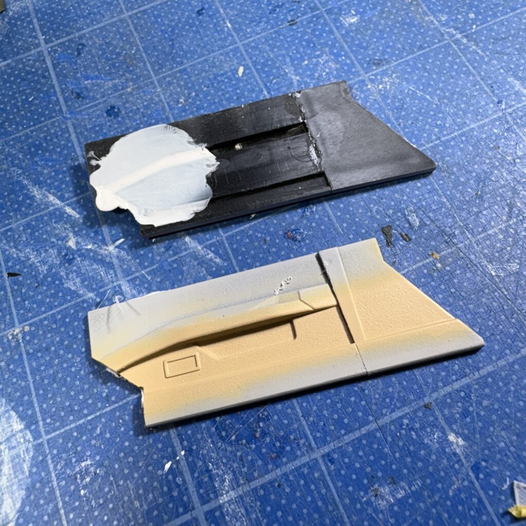 ボディと一緒にグレーのサフェーサーを軽く吹き、タイヤハウス部を調整したリヤシートと一緒にモールドのヒケやプラシートとの境目などをタミヤパテ(白)で調整。