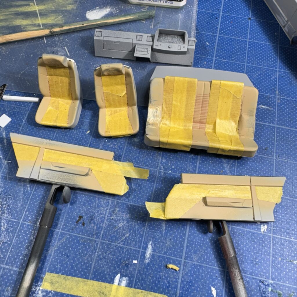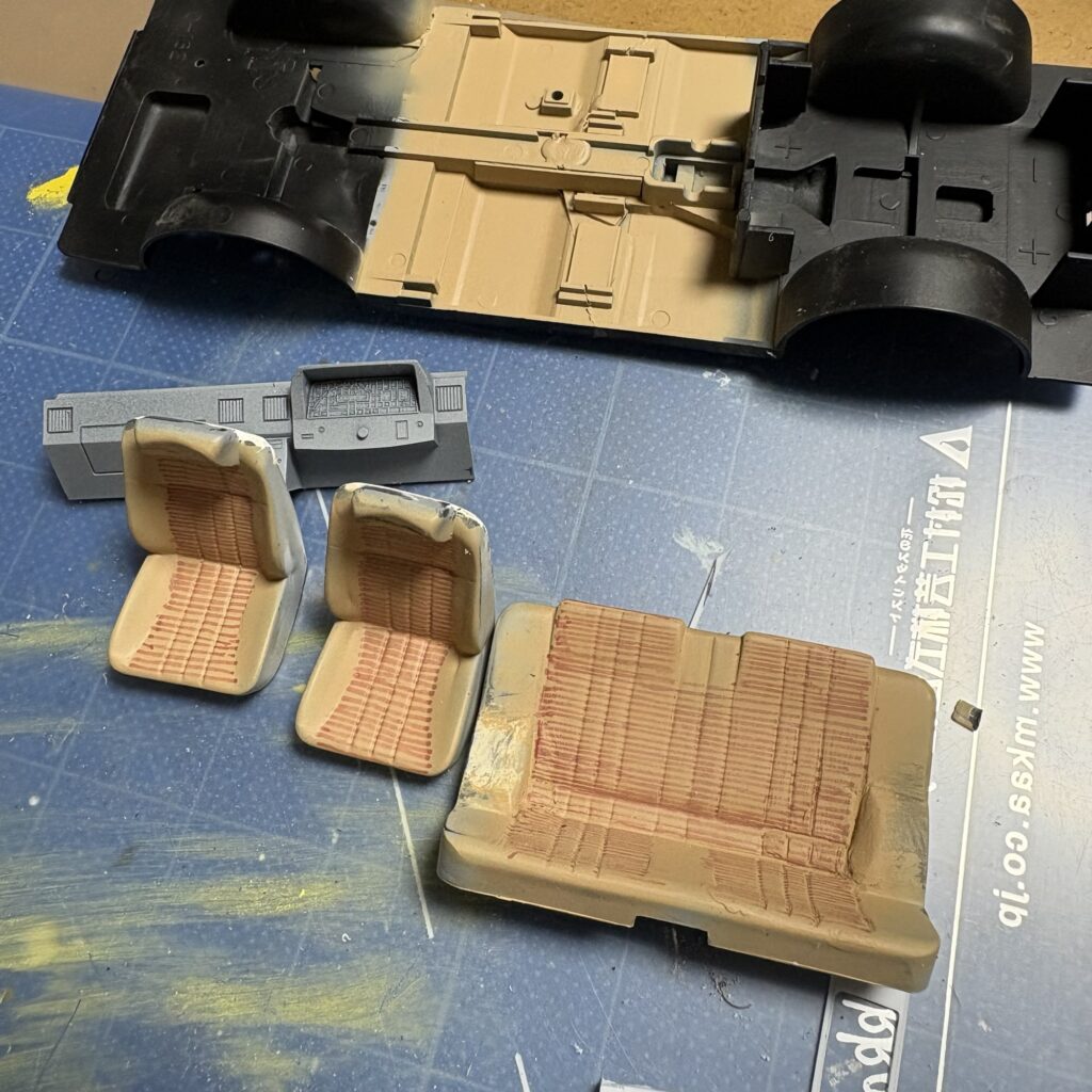 シートに縞を描いたマジックの線が濃く、和らげるため、内張の塗り直しとフロアを塗るついでに切り替え部に砂吹きし色を和らげた。