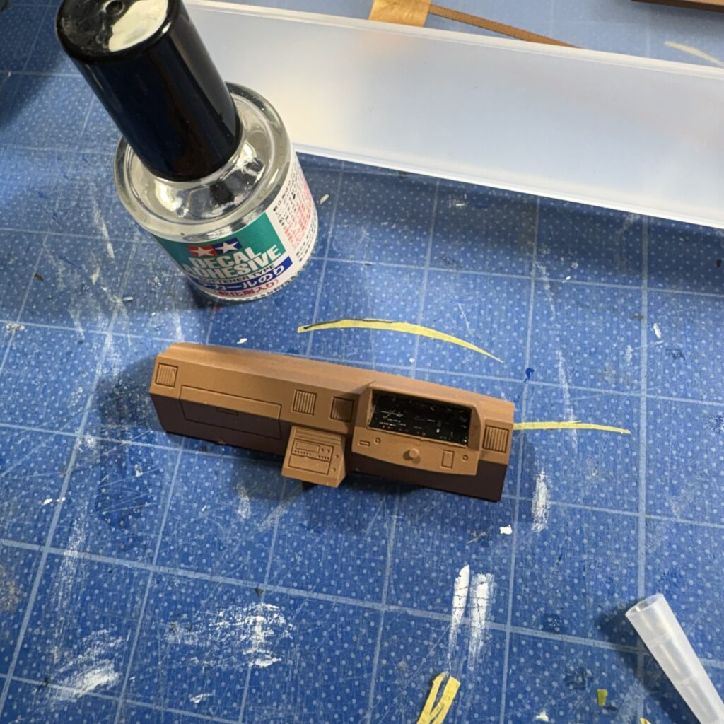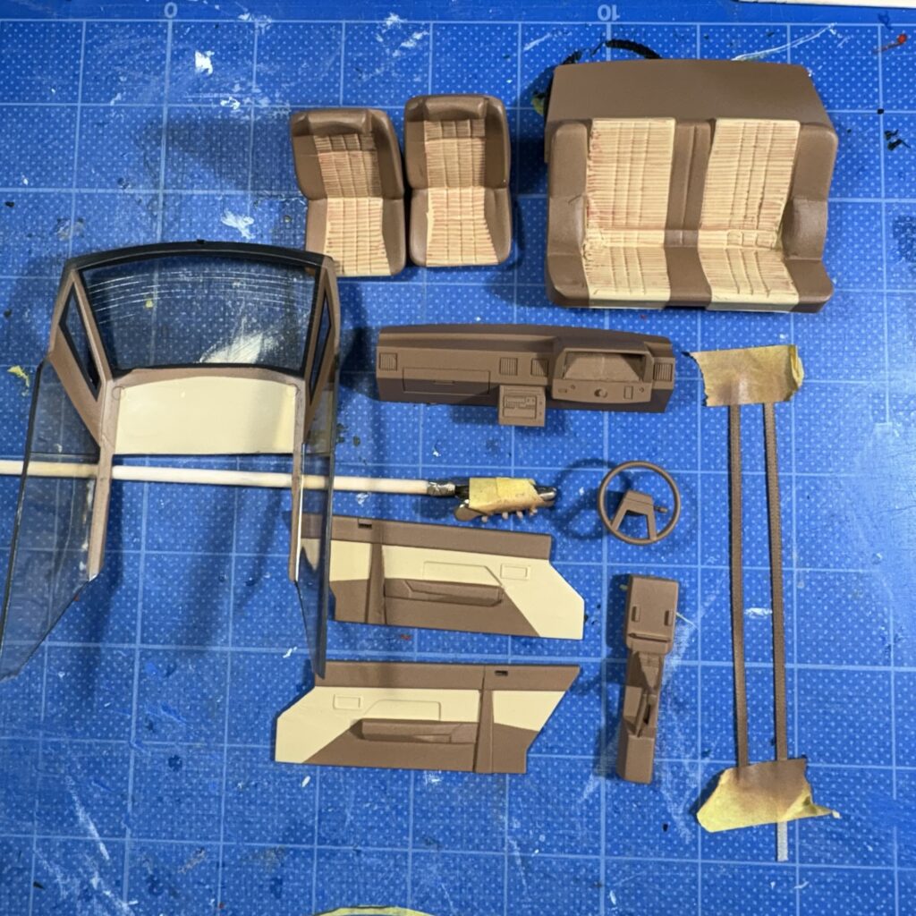 キットの仕様は黒系内装だが、知人の愛車は茶系だったので変更。キットには切り替え部の黒いストライプのデカールが付いているが使用しない。