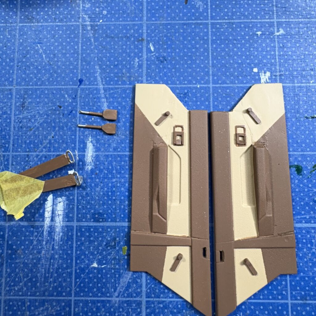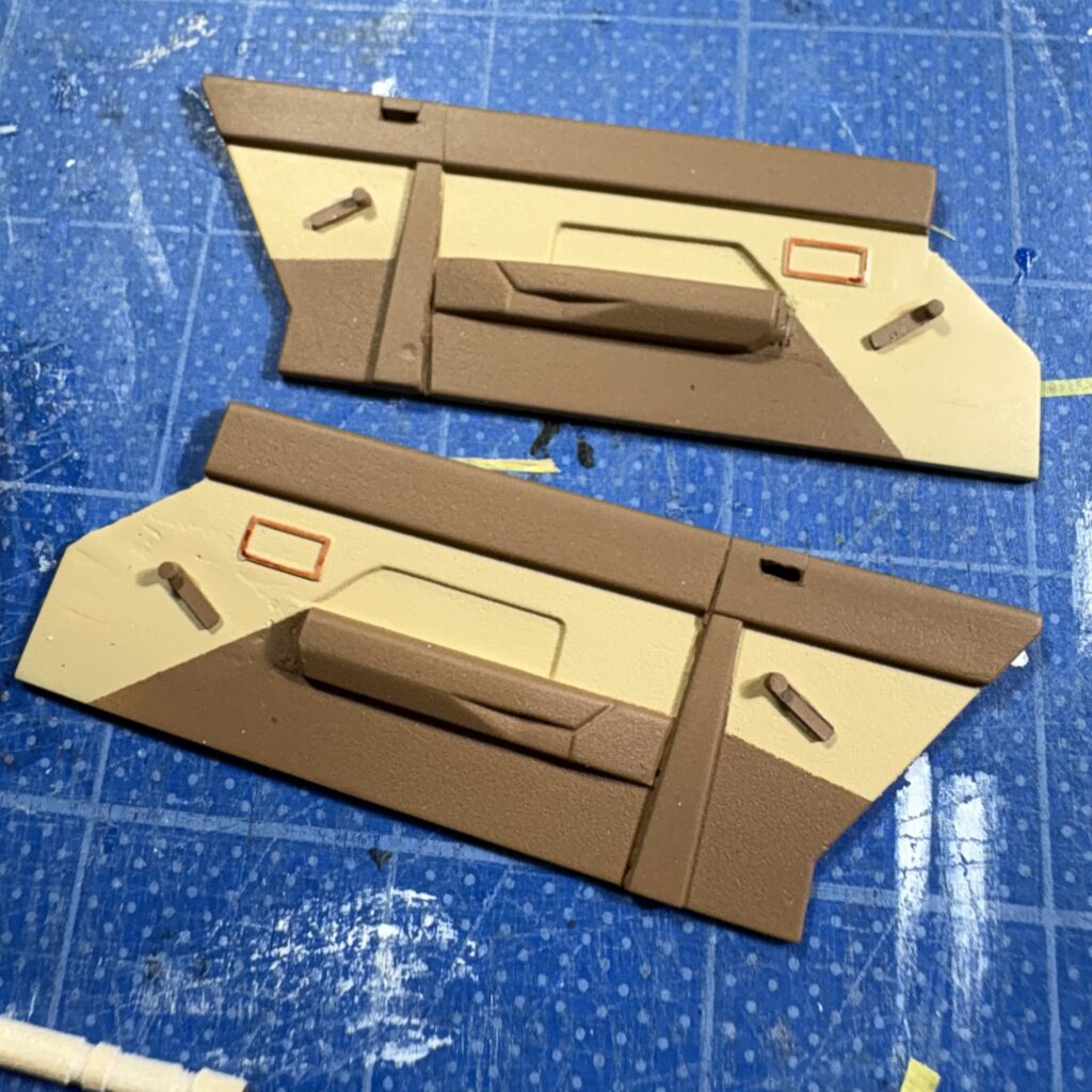 フロントシート用の上下アンカーをクレオスC44ウッドブラウンで筆塗した、上のアンカーの金具の下半分はタミヤのエナメル、クロームシルバーを塗った。写真を撮り忘れているが、後席側の内張りは上部をコの字型に切って1.2tのプラシートで蓋をし、フロント用シートベルトの出口を作ってある(長穴をあけるより楽)。