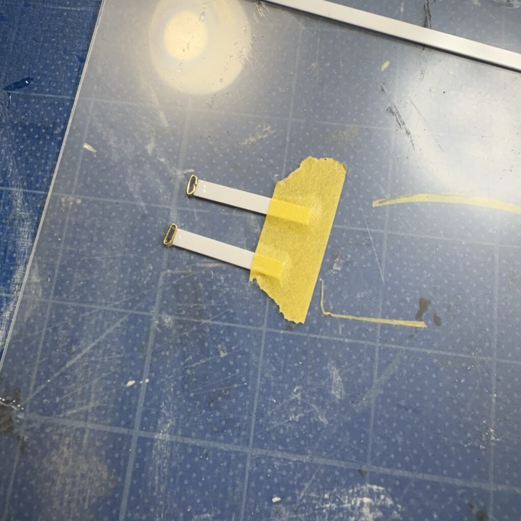 3mm幅に切り出した0.5tのプラシートに0.5Φの真鍮線を「O」の字形に曲げたものを瞬間接着剤で接着