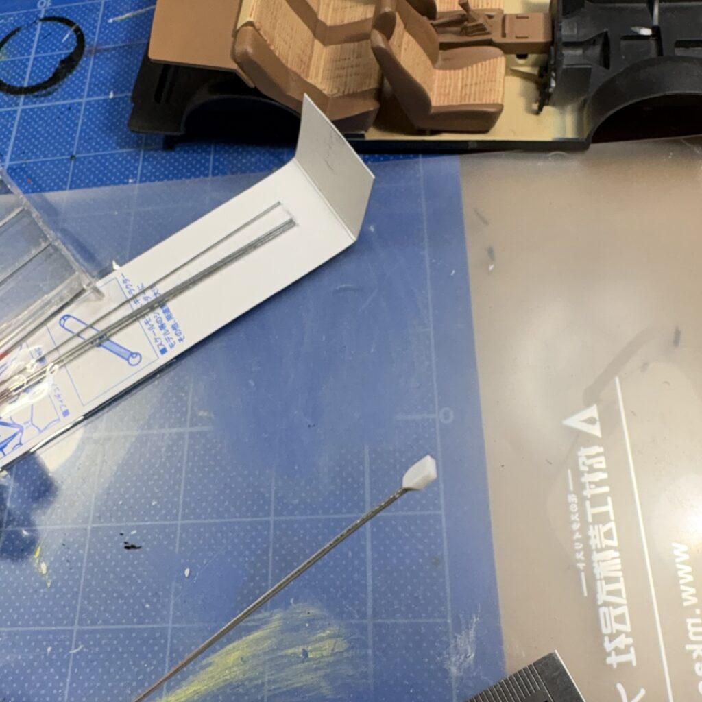 3mm幅に切り出した1.2のプラシートの帯にピンバイスで0.85Φの穴をあけ、0.8Φのアルミ線を差し込み瞬間接着剤で接着。将棋の駒のように根元の角を落として断面にはエッチングのこで溝を入れた。
